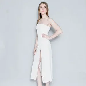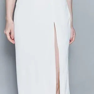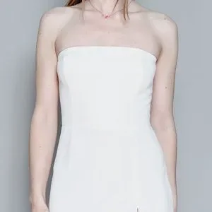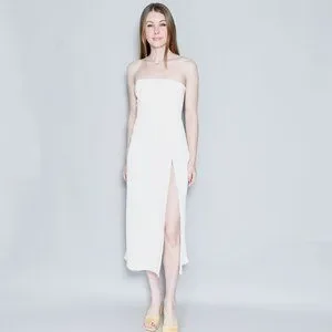 Amanda Uprichard ivory "Mandy" strapless midi dress with a slit, smocked back panels, invisible back zipper.