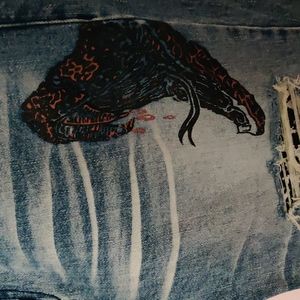 Reason brand men's skinny distressed jeans. Colored inserts.Five pockets. Button at the waist,engraved "Reason.Top hit brand".