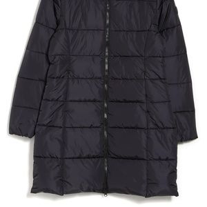 This puffer coat with a stand-up hood is designed to keep you warm featuring hidden zip closure pockets and an elastic bungee cord to control air flow.