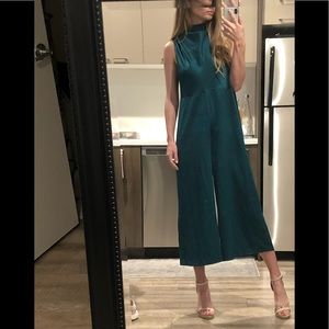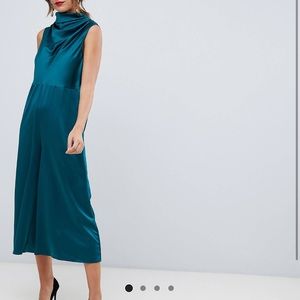 - Asos perfectly matching emerald satin cropped midi sleeveless cowl high neck jumpsuit. Zip back. Note that this has LEGS - it is not a dress. US size: 4
