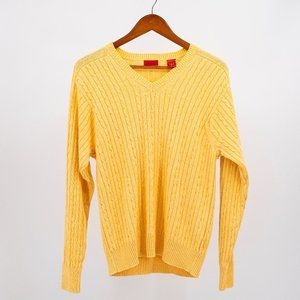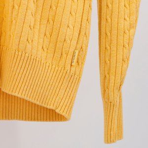 Vibrant tangerine / orange - yellow cable-knit 100% cotton sweater. Great for summer evenings or bringing some sunshine to an otherwise dreary day! Classic V-neck cut. Cut and knit play to classic preppy style, but the color makes it play well with modern twists. Excellent pre-owned condition - no visible flaws.