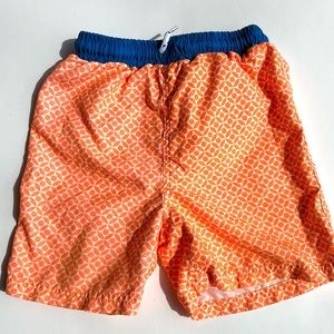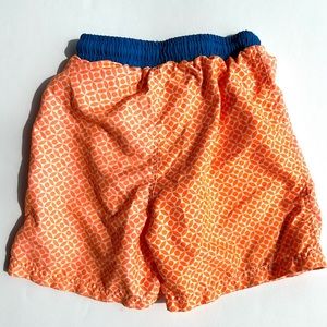 Mini Boden orange pattern swim trunks with blue waistband size 5-6Y