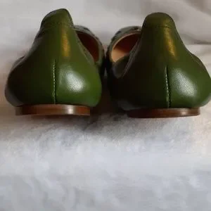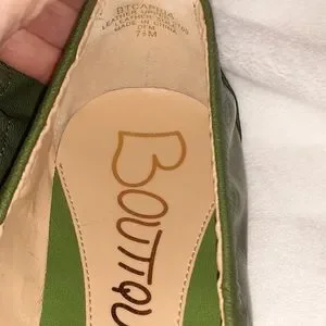 Boutique 9 (Nine West) 7.5 Leather Green flats with brass metal detailing with box. Only signs of wear is bottom of shoes. Great/ Almost new condition Perfect Spring addition to any wardrobe!