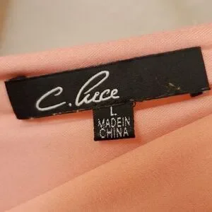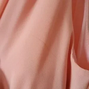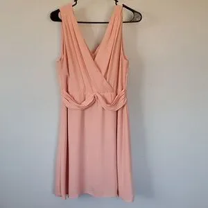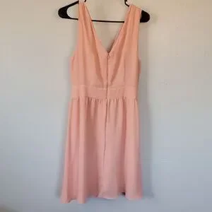 peach pink v neck chiffon dress. minor flaw on bust. zip up back. belt pulls taught when worn.