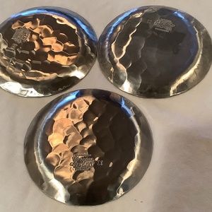 Hand crafted pewter mini plates. Approx 4.5” in diameter. Tooled stamp is clearly visible on the back of each. Could be used as coasters or just a small deco grouping. Smoke free home. Sell on Amazon for $15 each.