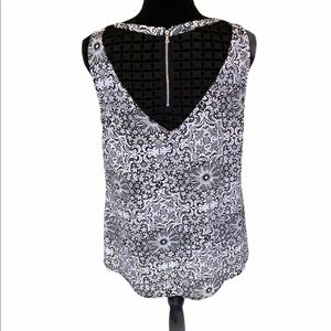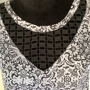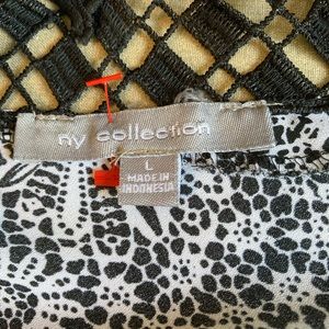 NY Collection black/white design NWOT sleeveless top featuring a black lace front / back neckline section,and gold exposed back neck zipper. Approximate measurements are shown flat and seller not responsible for brand sizing or fit since they vary even in the same brand so use approximate measurements as a guide. Beautiful,soft, silky, lightweight top.