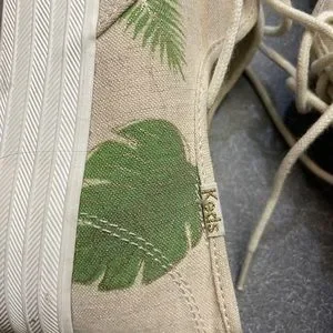 Unique Keds on platform with linen colored background and tropical leaf design