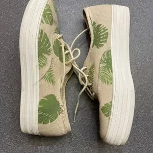 Unique pair of ultra comfortable Keds with orthotic soles. Thick white platform. Canvas in linen tan colored background with tropical leaves in shades of green and gold highlights and thick tan colored laces. Worn briefly once. EUC. 1 1/4 inch platform sole. Size 9.