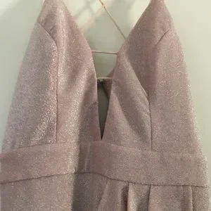 Blush pink sparkly evening dress with thin straps. Top lined and has part underskirt.