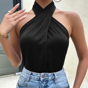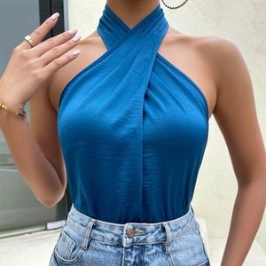 Blue crisscross open back halter top