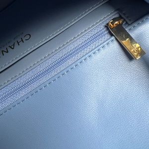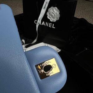 This chic mini shoulder bag is crafted of diamond quilted lambskin leather in a light blue. The crossbody bag features a long light gold chain-link leather threaded shoulder strap and a front flap with a light gold CC turn-lock. The flap opens to an interior of matching light blue leather interior with pockets.