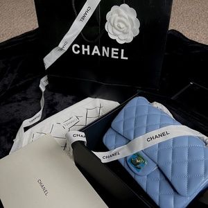 CHANEL Lambskin Quilted Mini Rectangular Flap Light Blue
