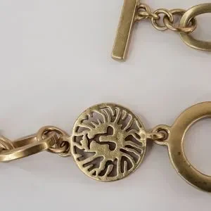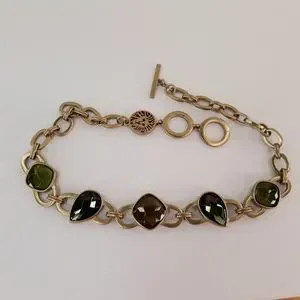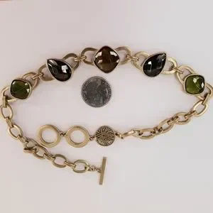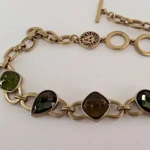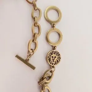 Gorgeous heavy brushed / matte satin gold tone Anne Klein linked chain necklace. Has lion head for signature piece near the circle and bar closure. Wonderful vintage lucite "Mogul jewels" of green, blue and coffee. Chunky, statement necklace that never goes out of style.
