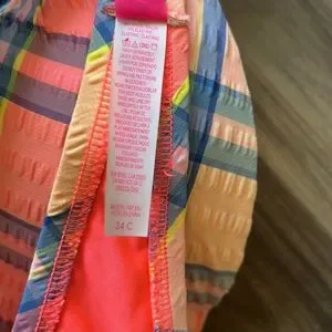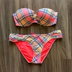 Two piece gingham seersucker bathing suit. Yellow, light blue, orange and green pattern. Bandeau padded underwire push up top (missing bra type straps). Adjustable strap at back. High cut bikini bottoms with moderate coverage back. Fully lined in neon orange on both pieces. Pieces can be bought separately by adding suit to bundle and messaging me. EUC with no visible fading or pills. Please refer to photos as they are a part of the description.