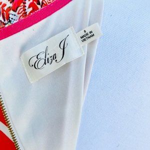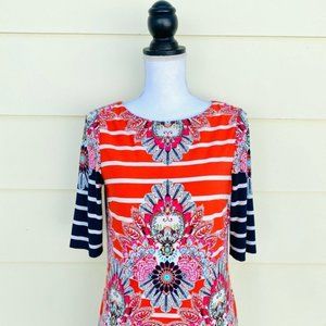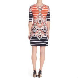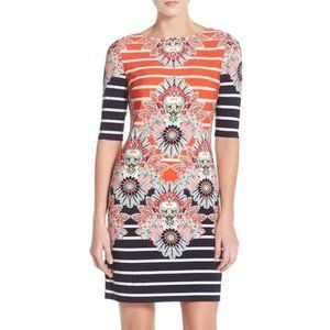 A vibrant array of multicolored stripes and floral designs captivates attention on this sleek, fitted sheath dress cut from a soft and stretchy jersey.