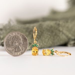 Fruit, but make it fashion! These earrings would be perfect for anyone who prefers a fun earring with a lot of sparkle. These pineapple huggies are made of tungsten metal and feature bright CZ stones. The earrings have a pin earring back for pierced ears. See photos for size context. There is only 1 pair left.