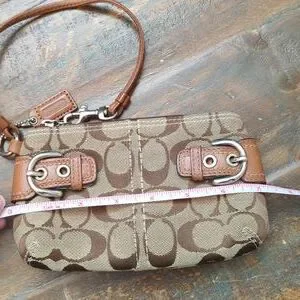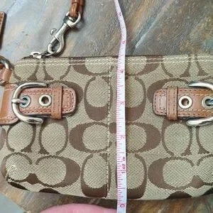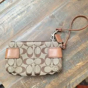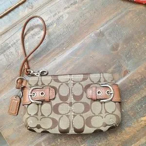 Excellent condition tan Coach wristlet with 2 leather buckles on each side. No card slots on the inside. Dimensions are 4.5" X 7".