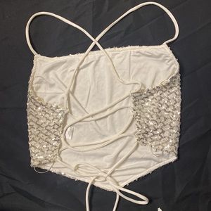 Sparkling cross cross pattern and tie crop top. Has some stretch to it. Adjustable back ties. Only worn to try it on.