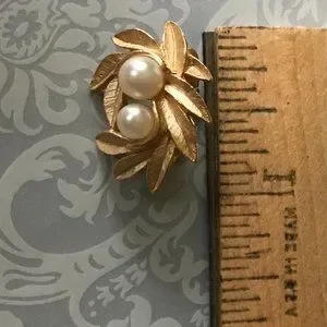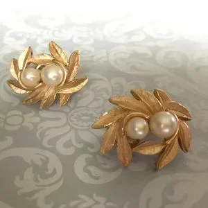 Lovely pair of vintage Avon clip-on earrings with simulated pearls and fine detailed botanical styling in gold tone metal. Earrings are from Avon's 1971 Evening Creation Collection and are in excellent vintage condition.