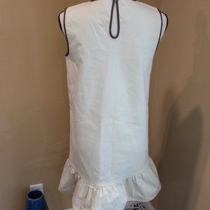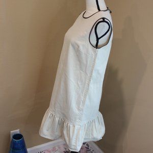 Great dress by Kate Spade with a Drop Waist Ruffle hem Shift Dress. Sleeveless with Leather Trim around the Neckline and Sleeve openings. Loop opening in back wit hook closure.Side Zip in Sz 6