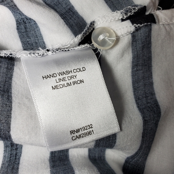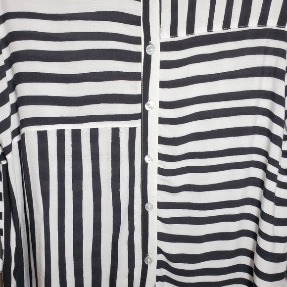 This modern take on the button down blouse features a bold blocked stripe pattern in chic black and white. The ultra soft fabric has roll tab sleeves and a collar that provide a classic silhouette. Vertical and Horizontal Stripes
