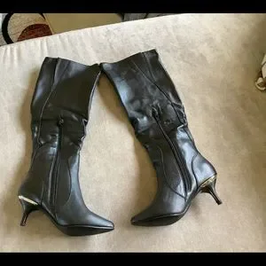 Ladies Mark genuine leather black tall boots with zip on inside and silver accent on heels. New in packaging size 6
