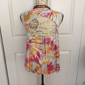 Cute and comfy tie-dyed, and unique and stylish details in back! Made of 57% cotton, 38% modal, 5% spandex, this fashionable tank top "supports more sustainable cotton farming." Machine wash with like colors gentle cycle. This top is BRAND NEW and tag recommends that you wash before wearing. Tumble dry low.