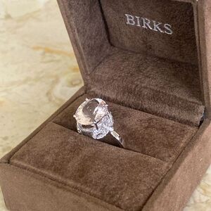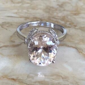 Exquisite, one of a kind, custom made estate piece! This impressive ring features a stunning natural oval very light pink morganite and genuine diamonds set in a unique and fancy solid 14K white gold setting.