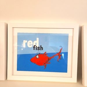 Set of 4, 9in by 11in white framed prints. EUC, some scratches on white frames. Purchased at the Chicago Water Tower Dr. Suess Museum. These retail for over $70 each. Sold as set, will not divide.