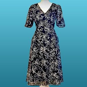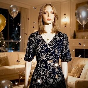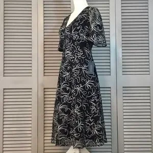 Beautiful NWT Tommy Hilfiger v-neck special occasion, cocktail, party, black dress with short flutter sleeves. Waist is 15”, from armpit to armpit is 18” and length from shoulder to hem is 42 1/2”. (Measurements were taken while dress was laid flat and are approximate.) Both shell overlay and lining are 100% polyester. Size 8