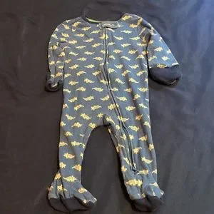 —CloudIsland- blue with white Dino’s- closed feet/ option for open or closed hands. Inverted zipper.