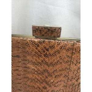 Vintage Handbag Faux Snakeskin 1940 Caramel Color Fashionable. Metal push opener, metal feet, two inside pockets with one having a zipper closure. Very c clean inside with no stains, damage or wear. Outside material has wear on bottom corners, sides in very good condition. Condition is “Pre-owned". Handle has two cracks in what appears to be covered plastic. Does have wear. Shipped with Standard Shipping.