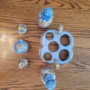 ~ 5 piece set with tray ~ includes: salt & pepper (corks intact); Vinegar & Oil with glass stoppers; Sugar with spoon and lid.