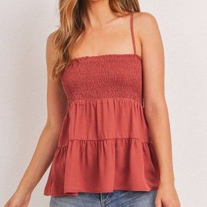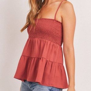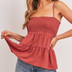Brand new rust red colored tiered tank top with a smocked bust and adjustable spaghetti straps.