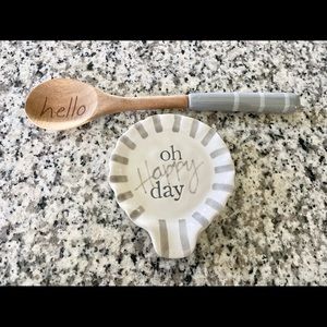 This 2-piece happy spoon rest set includes a hand-painted ceramic spoon rest with a ruffled rim and an engraved wooden & ceramic spoon