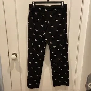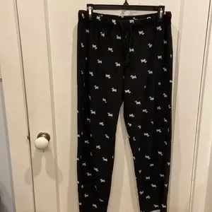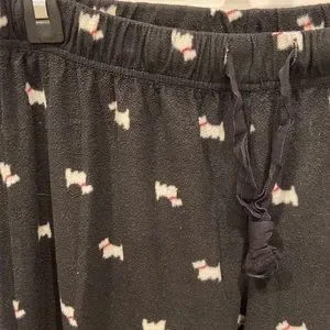 These pajama pants are a very lightweight fleece. They have a Scottish terrier dog pattern. In good used condition with slight pilling. Super comfortable and plenty of where I left. BN529