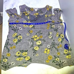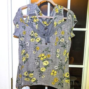 Beautiful floral print top by style & co. The top features a peekaboo shoulder, lace trim and tassel ties. The color combination makes it easy to pair and accessorize. Lightly worn but very good condition no stains or flaws. Measurements in photos.