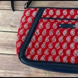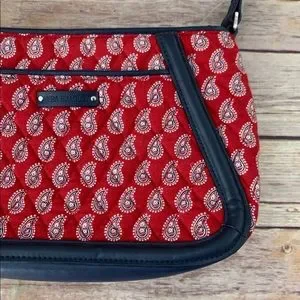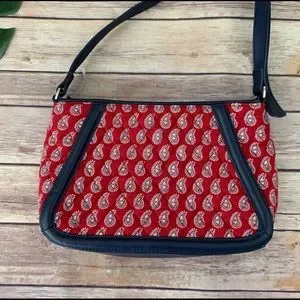 Vera Bradley PETITE RED BANDANA PAISLEY Trimmed TRAPEZE CROSSBODY NWT Retails $78 14597-349951 Size is approx. 10 3/4" X 7" X 1 3/4" with a 53" adjustable strap. Carry as a crossbody style, or over the shoulder. It has a top zippered closure . A front slip pocket, and a zippered inside pocket. This is a very beautiful bag.