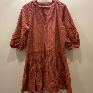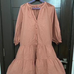Very pretty dusty pink sort of colour. Cover picture is the exact colour of the dress. The fabric is self textured. The dress has tires and a button upfront with elastic on the cuff. And V-neck. The dress fits from M to L. If needed please ask for the measurements, will be happy to provide them.