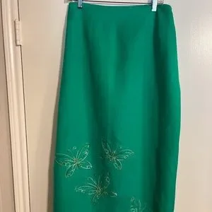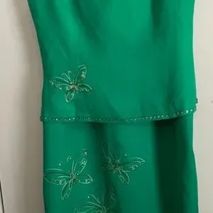 Jessica Howard Kelly Green 2 Piece Top and Long Skirt. Skirt is approximately 37 " long and has Kick Pleat in back. Skirt also has back zipper & elastic. Front of Skirt is Flat( no elastic )& Has 3 Embroidered Butterflies with tiny Beads. The Top has 1 of the same Decorative Butterfly and Trim on the Bottom & Top.