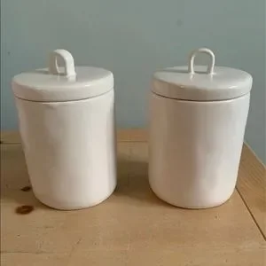 Brand new set of 2 Rae Dunn bone white canisters with gold lettering‘s goodies and crunchy comes from smoke free home ship next day pack with care approximate dimensions are as follows about 8 inches tall with lid on about 5 inches wide