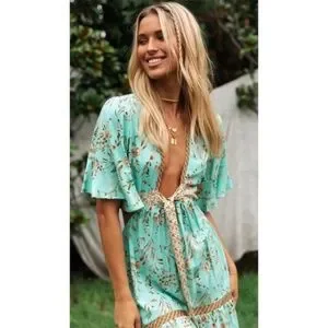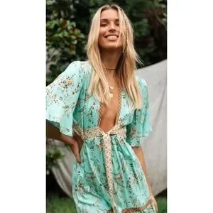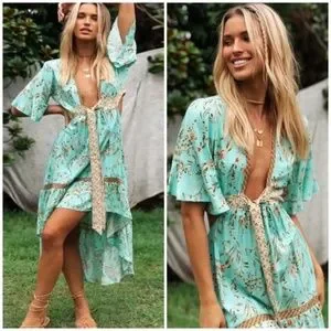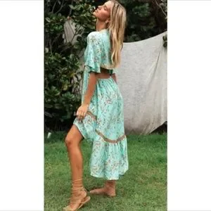 Gorgeous mint dress with floral bohemian print. Deep plunge neckline opens into a cutout style backside - gives the appearance of a skirt and crop top. Ruffled hi lo hemline skirted bottom.