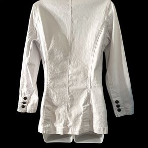 DG2 (DIANE GILMAN) VINTAGE WHITE DENIM EMBELLISHED BLAZER…HIGH QUALITY DENIM WITH STRETCH! XS BUT VERY GENEROUS FIT! EXCELLENT CONDITION. PERFECT FOR SPRING/SUMMER
