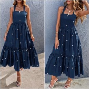 Boho Navy Blue Embroidered Floral Criss Cross Ruffle Dress