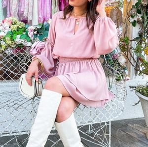 Step into a blush dream in the Amore Dress. This piece is incredibly flowy and cinches at the waist and wrists. Perfect for your next lunch with the girls!