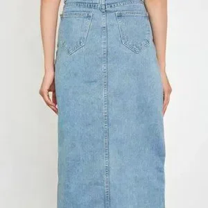 This denim midi skirt has a unique asymmetrical flair. Features a high waistline and a slit hem. Pair with sneakers and shirt for your both lazy and active days. Made of smooth cotton, viscose and polyester.