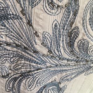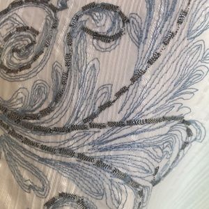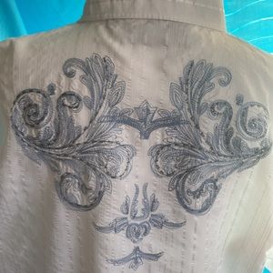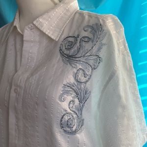 This is a men’s white shirt sleeved shirt. It has a white shiny stripe & embroidered details on the front & back. The embroidery has a silver metallic thread!!