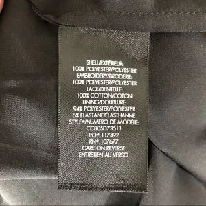 100% polyester; 100% cotton; lining 94% polyester, 6% elastane