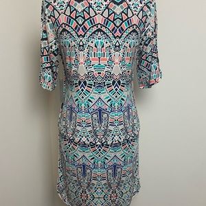 New with tag. Multi colored bohemian Aztec print drop waist 3/4 sleeve scoop neck spring summer beach vacation mini/midi dress with piping style seams. Stretch for comfortable and mobility. Size medium.