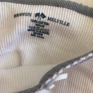 Comfortable white ribbed tank with a square neckline, blue and white lace on the neckline and suspenders, and a bow at the neckline.